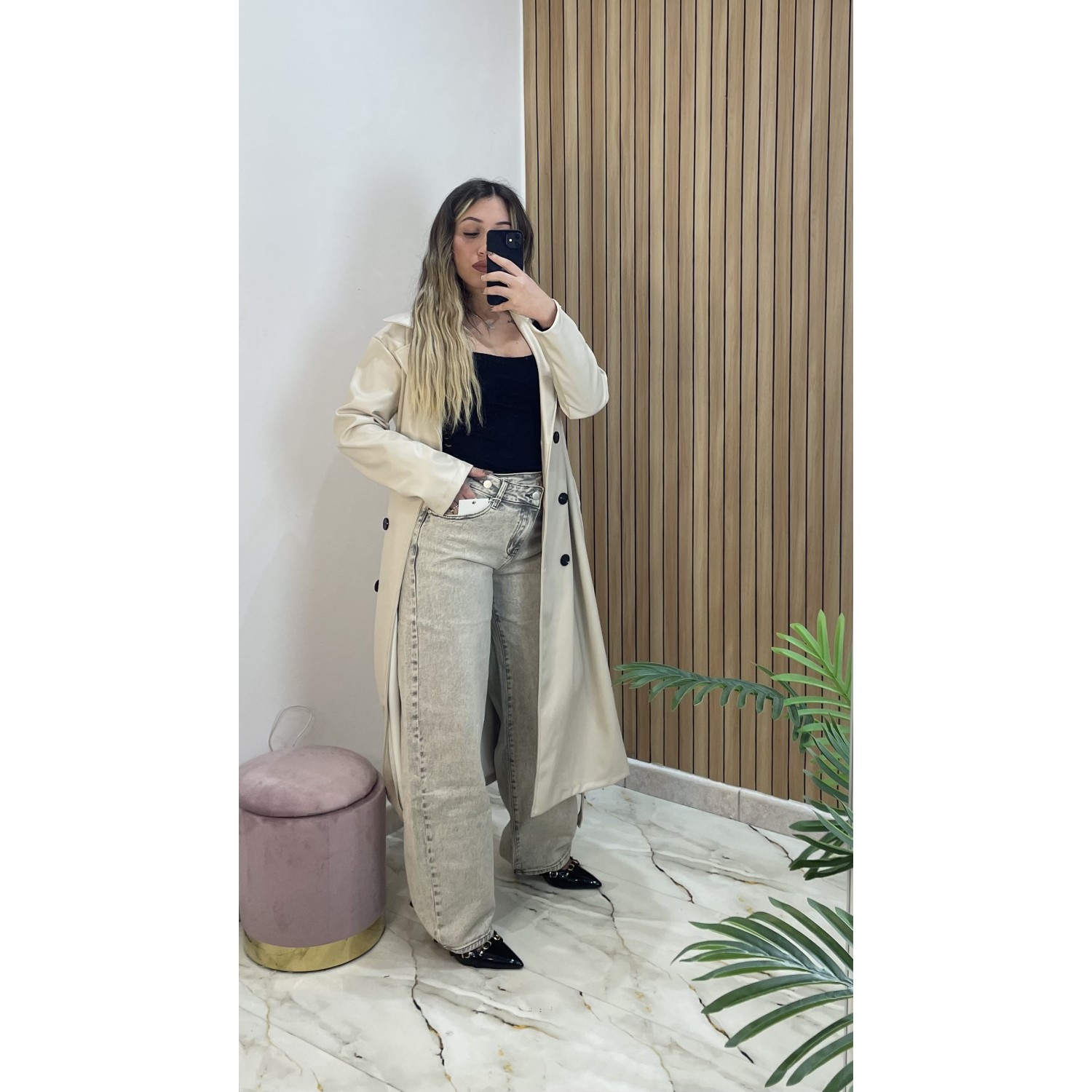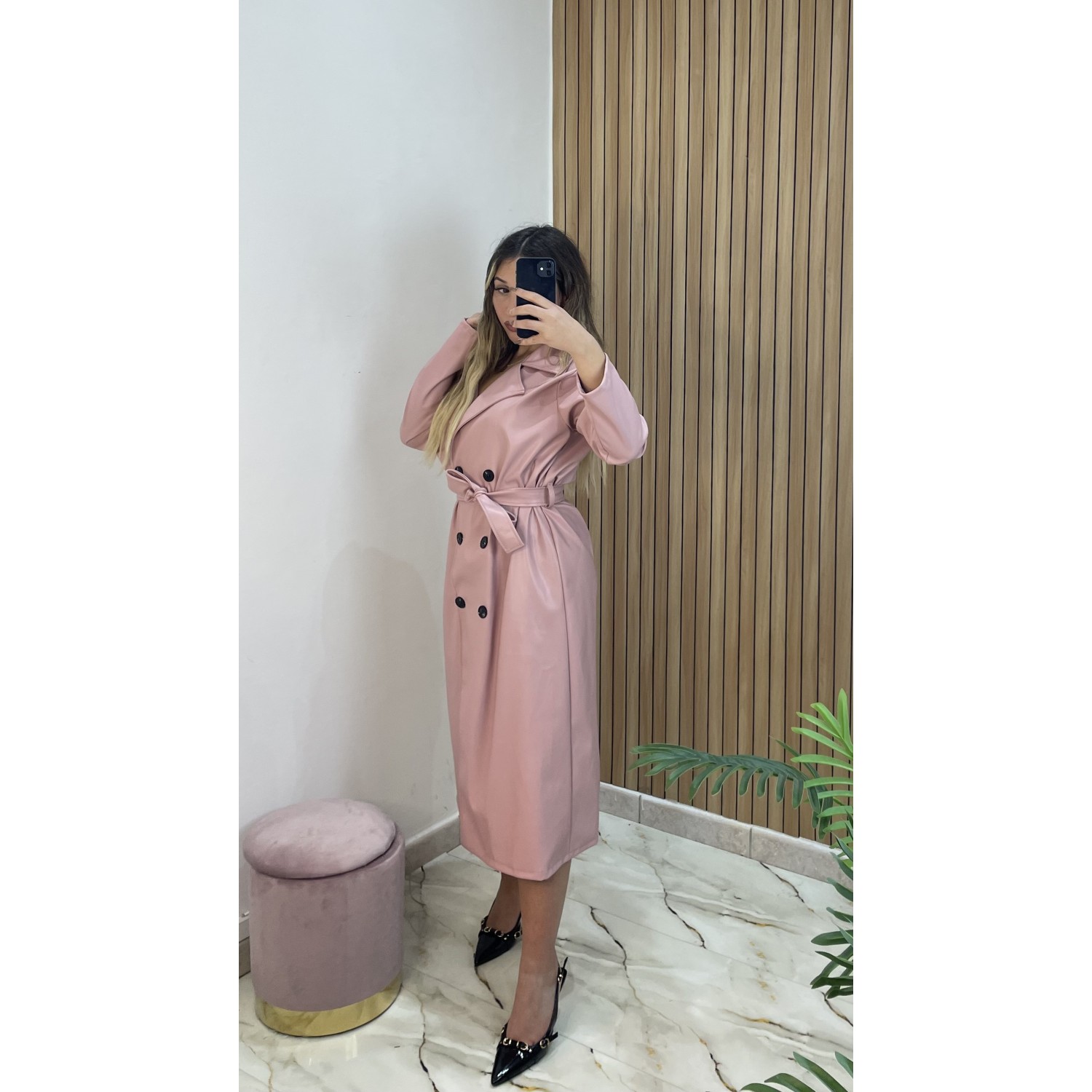 Trench in pelle dal design elegante e strutturato, con chiusura a doppio petto e bottoni apribili. Dotato di fusciacca in vita per valorizzare la silhouette, lunghezza midi e linea raffinata. Ideale per completare look chic e contemporanei.
