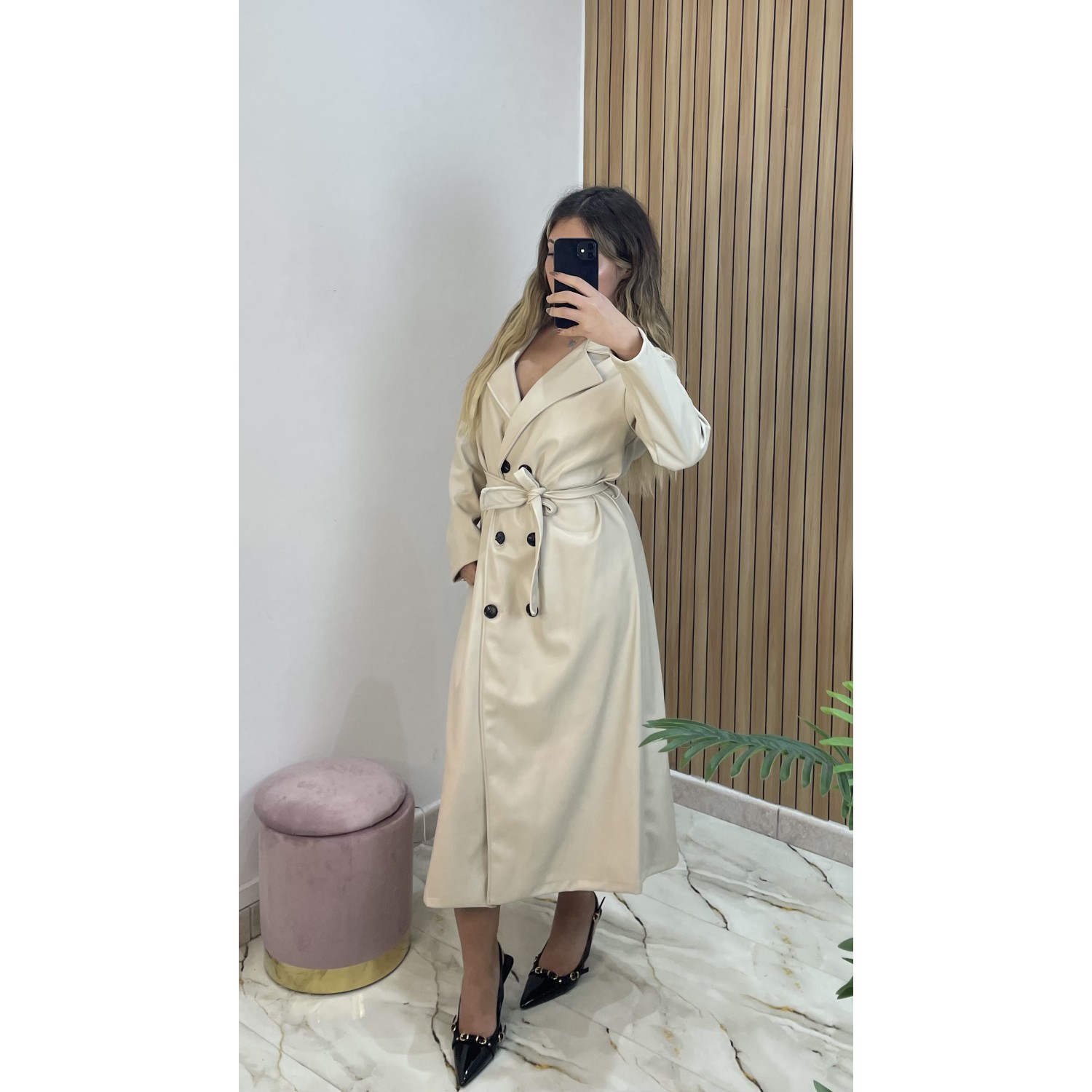 Trench in pelle dal design elegante e strutturato, con chiusura a doppio petto e bottoni apribili. Dotato di fusciacca in vita per valorizzare la silhouette, lunghezza midi e linea raffinata. Ideale per completare look chic e contemporanei.