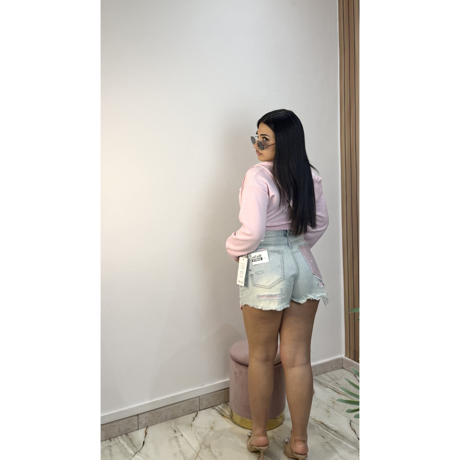 Pantaloncino tessuto rigido con tasca strass rosa e abrasioni sul retro. Calza bene, la ragazza è taglia S e indossa la S.