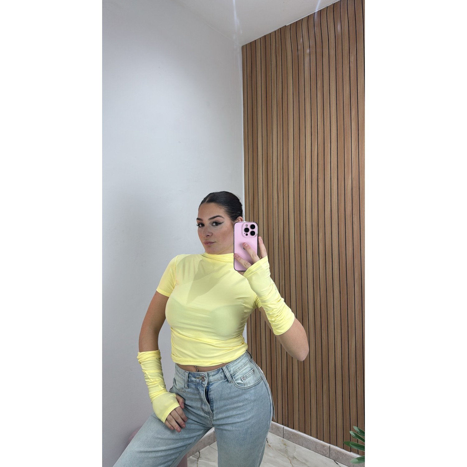 Maglia in lycra elasticizzata, disponibile in vari colori, taglia unica, manicotti rimovibili con manica a guanto.