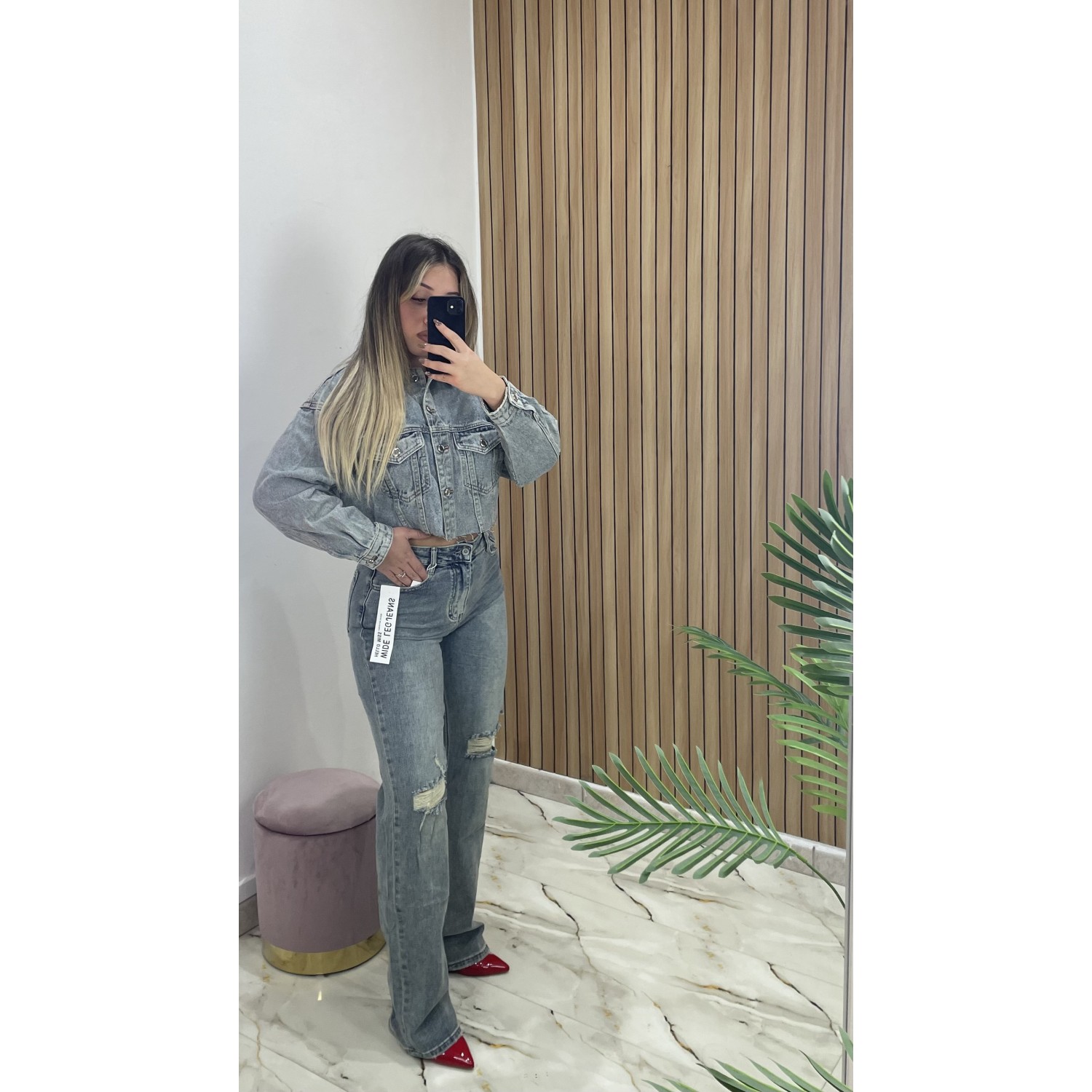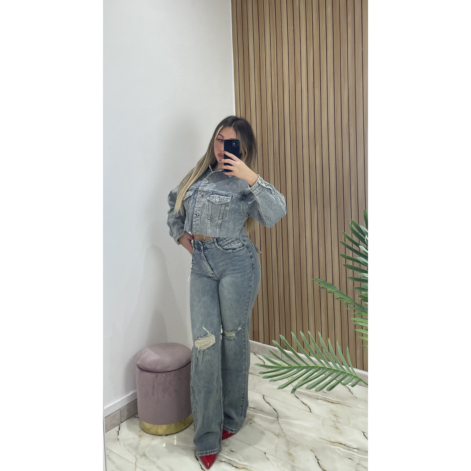 Coordinato lavaggio sabbiato, poco elastico, jeans porta strappi sul davanti, mentre la giacca anche va a taglie ma tranquillamente qualsiasi taglia vi va bene cambia solo la misura della lunghezza delle maniche. Io  sono una taglia S e indosso la S di tutto.