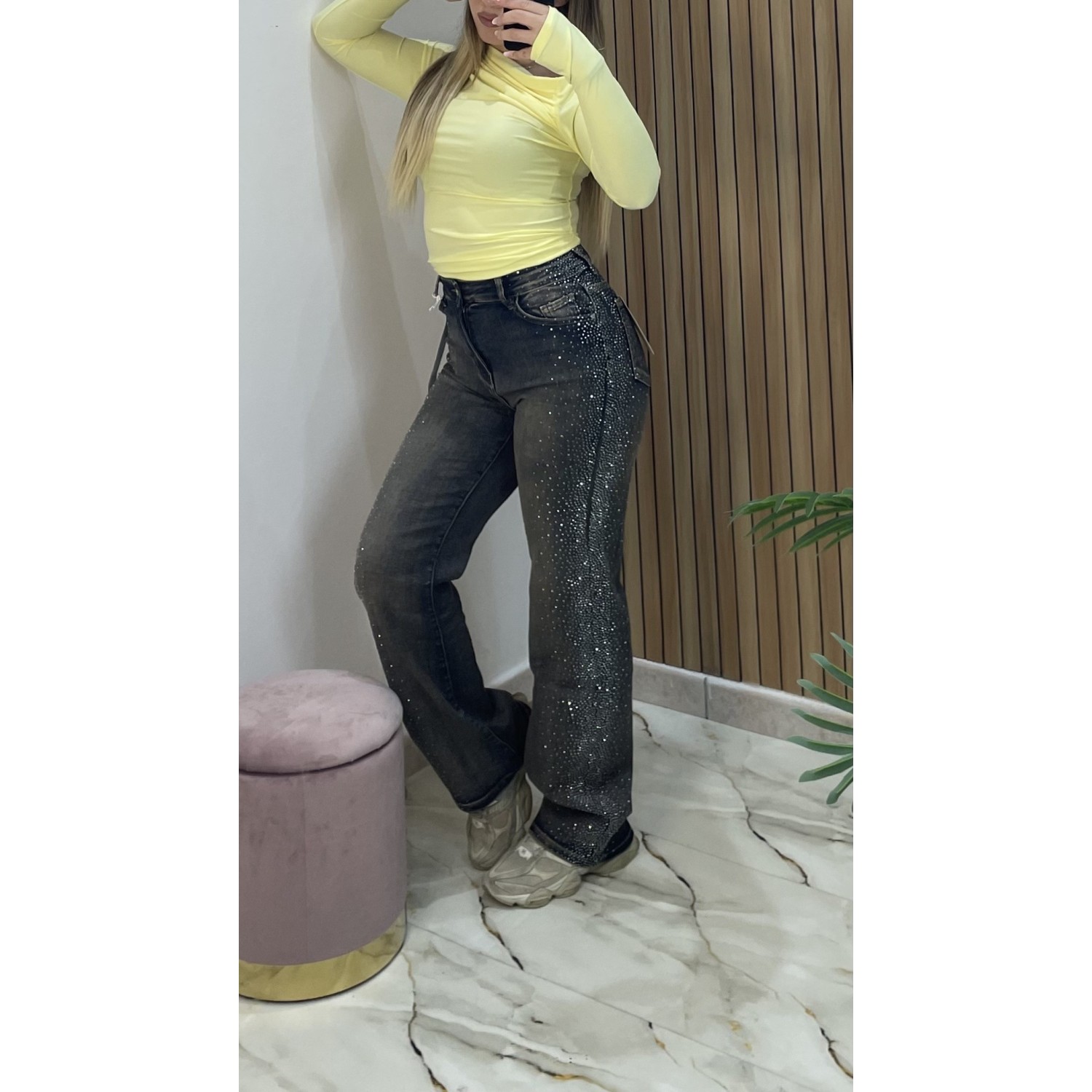 Jeans con strass laterali leggermente elastico, lavaggio sabbiato. Io indosso taglia S e sono taglia S.