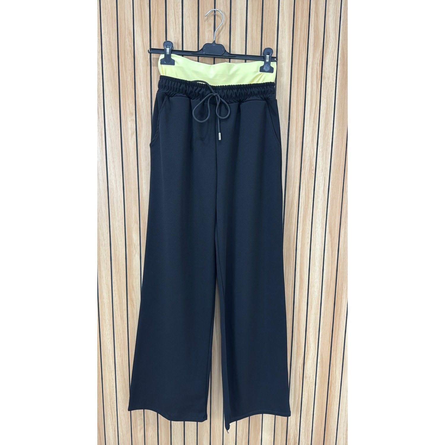 Pantalone a fondo largo in taglia unica, caratterizzato da una doppia molla in vita che garantisce comfort e ottima vestibilità. Il modello presenta una linea fluida e morbida, ideale per slanciare la figura e adattarsi facilmente a diverse corporature. Perfetto sia per look casual che più curati, grazie al design essenziale e versatile.