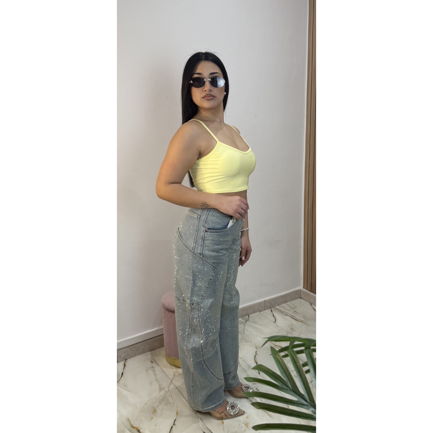 Jeans elasticizzato con strass avanti e dietro. Calza bene, la ragazza è taglia S e indossa la S.