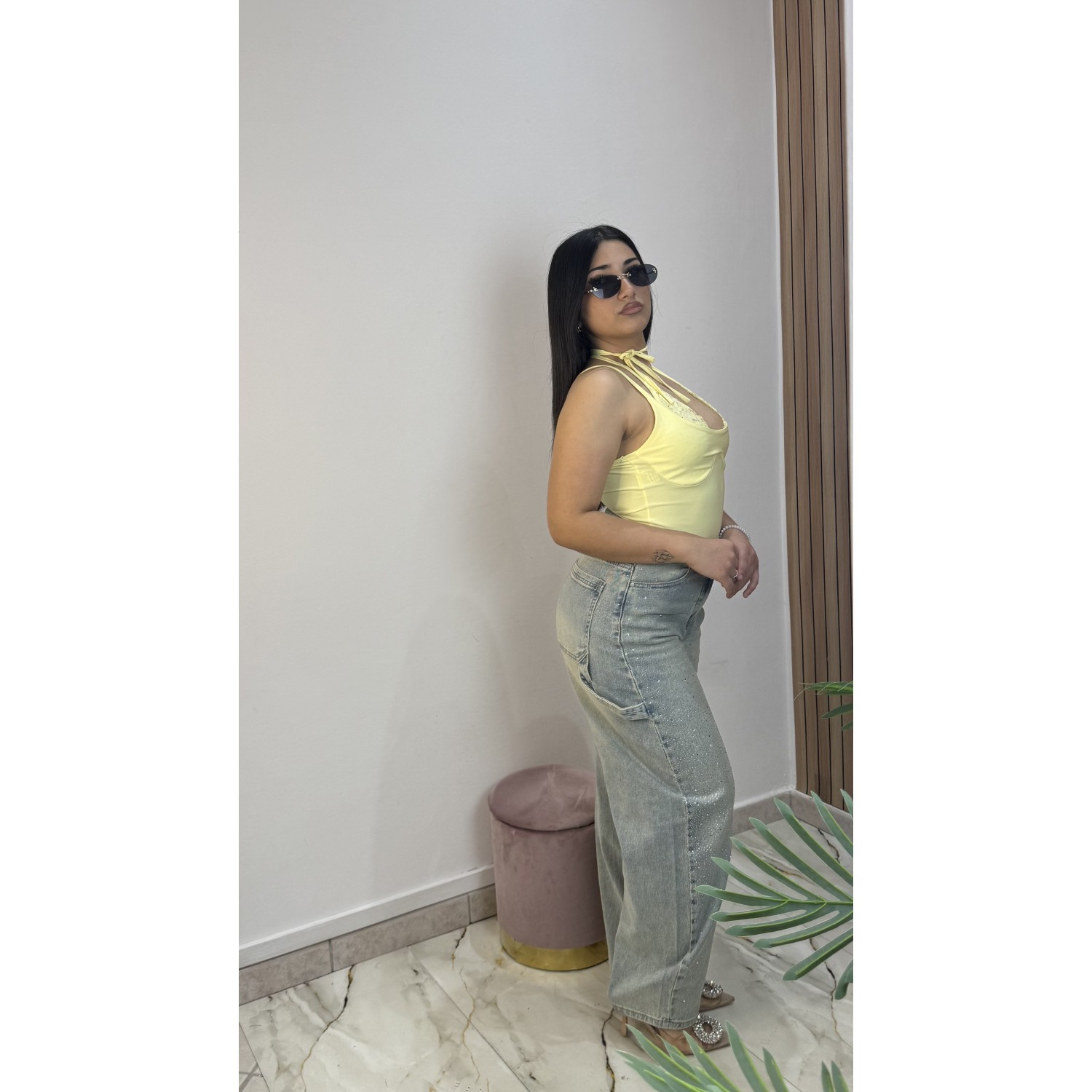 Jeans modello ballon con strass solo avanti, tessuto elasticizzato, calza bene, la ragazza indossa la S ed è taglia S.